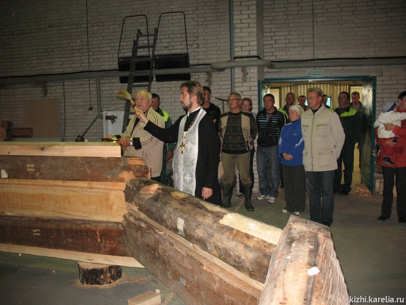 В реставрационном цехе был прочтен молебен за скорейшее возрождение Преображенской церкви, после чего произошло окропление святой водой реставрируемых элементов сруба памятника. После свершения церковных таинств кижским реставраторам была подарена икона Преображения Господня.