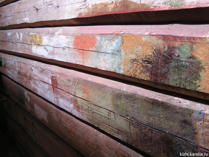Есть предположение, что колокольня Кижского погоста на долгие годы, почти на 150 лет (с 1865 года), хранила на своих стенах следы разноцветной исторической краски, которой в разное время были покрыты церковные стены и главки. Только в этом году совершенно случайно я обратила внимание на казалось бы небрежный наброс крупных мазков кистью масляной краски разных цветов на брусчатых стенах ее кладовой.