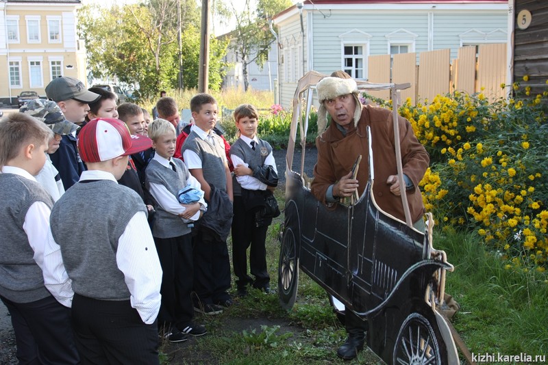 Программа у наших гостей была необычайно насыщенная. Каждого ждала прогулка по кварталу исторической застройки с экскурсией, которую для них провёл Борис Гущин, старший научный сотрудник отдела истории и этнографии. И надо отметить, что всем посетителям повезло, ведь в этот день в Петрозаводске, а именно в нашем квартале, остановился «господин полковник Муяки» — роль его исполнил артист Театра Кукол, Александр Довбня — гость из Петербурга, который в 1911 году проездом посетил наш город во время путешествия к водопаду Кивач. До его приезда петрозаводчане никогда не видели «самодвижущегося экипажа», а поэтому визит полковника стал целым событием. Наш герой с удовольствием рассказал гостям о своём автомобиле и о путешествиях, которые на нём совершил.