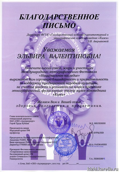Музей-заповедник «Кижи» в лице директора Э.В. Аверьяновой и всего коллектива благодарит Петрозаводский филиал ОАО «Банк «Возрождение» за возрождение традиций русской городской культуры и надеется на дальнейшее плодотворное сотрудничество.