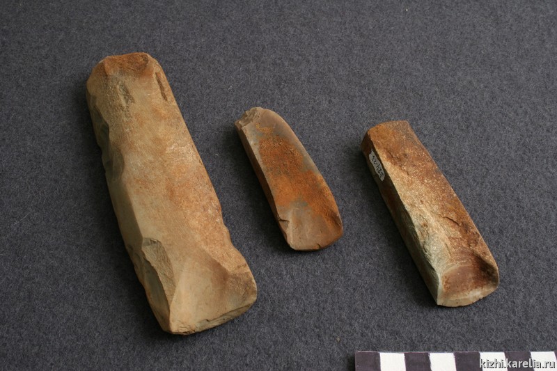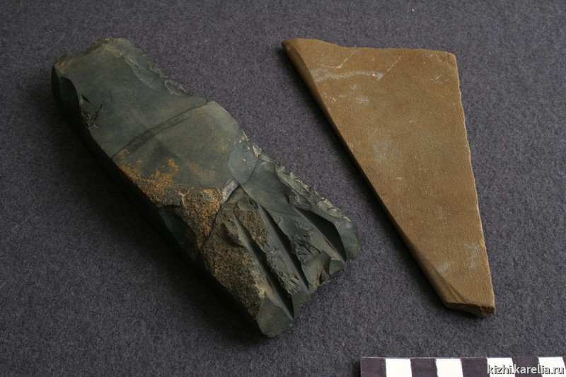 Были продолжены работы по выявлению и исследованию памятников эпохи камня в районе д. Телятниково. Найдены они были совершенно случайно, так как нельзя было и представить, что по берегам маленького пересыхающего летом ручья когда-то могли жить люди. Начало открытию было положено в тот момент, когда один из студентов, который был на археологической практике, нашел на дне ручья кварцевый скребок. В результате археологических работ в 2010 году было открыто три поселения эпохи мезолита возрастом 7 тысяч лет с богатыми находками, а в 2011 году еще один памятник, но уже периода неолита с ямочно-гребенчатой керамикой возрастом 5 тысяч лет. На каждом поселении были заложены разведочные траншеи площадью 20 кв.м каждая и получены интересные находки: фрагменты керамических сосудов, наконечники стрел из лидита, скребки из кремня и кварца, рубящие орудия из сланца, кварцитовые пилы и обломки со следами пиления (фото 1, 2). Большую помощь в раскопках оказали студенты Петрозаводского государственного университета (фото.3).