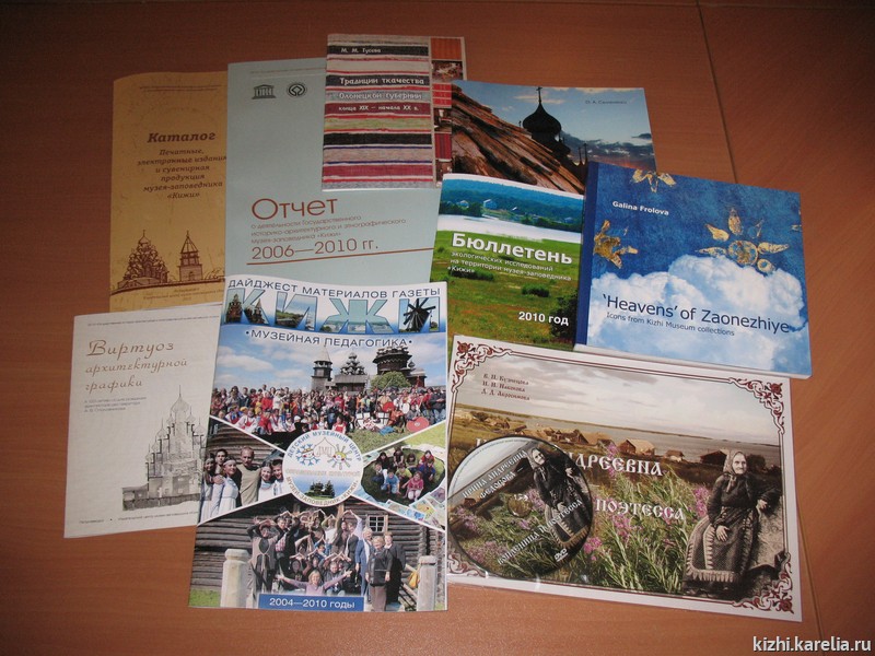 Также хочется отметить подготовку макета и выпуск книги научного сотрудника музея Г.И. Фроловой «Небеса» Заонежья» на английском языке. Благодаря этому изданию теперь с уникальной коллекцией заонежских «небес» могут познакомиться многочисленные англоязычные туристы, ежегодно приезжающие со всего мира на остров Кижи.