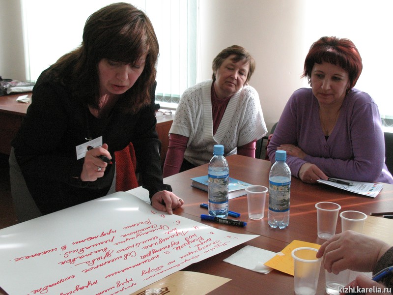 Первый «шаг» деловой игры был посвящен важному этапу проектирования — этапу выявления проблем музея. Сравнив их с проблемами региона, пришли к выводу, что многие внешние (региональные) проблемы являются также и проблемами музея. Второй «шаг» игры прошел в режиме «World Cafe» и был посвящен выработке проектных идей по следующим проблемам музея и общества: «Музейные программы и услуги для детей» (рук. С.А. Петрякова, руководитель студии «Кижская палитра»), «Молодежь и музей» (рук. А.И. Анхимова, НМРК, автор проекта «В гости к вепсам»), «Сохранение памяти о предыдущих поколениях» (рук. Д.Н. Кузнецов, НМРК, координатор конкурса «Меняющийся музей в меняющемся мире»), «Умение общаться» (рук. Н.А. Шевелева, заведующий музеем истории 9-й школы Петрозаводска), «Местная история и потенциальные бренды» (рук. Т.И. Гырнец, ведущий методист музея-заповедника «Кижи).