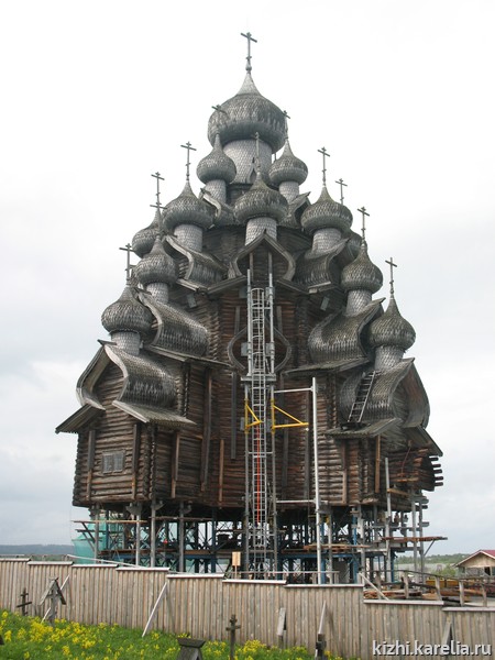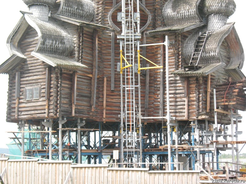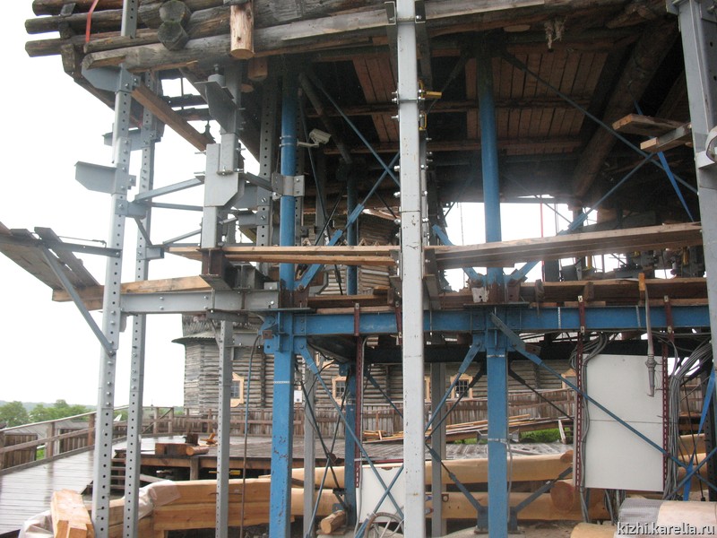 «Металлокаркас, установленный в 80-е годы, укрепляет не только сруб храма, но держит на себе все необходимые системы обеспечения: электрооборудование, датчики пожарной сигнализации и т.д., он помог смонтировать современную систему лифтинга, — говорит Александр Куусела, ведущий инженер службы реставрации музея-заповедника «Кижи». — Таким образом, каркас в полной мере справляется со своими функциями: технологической и страховочной системы сруба от деформаций. На мой взгляд, после завершения реставрационных работ и демонтажа каркаса следовало бы найти в музее место, например, на одном из островов по ходу движения теплоходов, и вновь собрать его. Пусть стоит на всеобщее обозрение как памятник инженерной мысли и колоссальному труду множества людей».