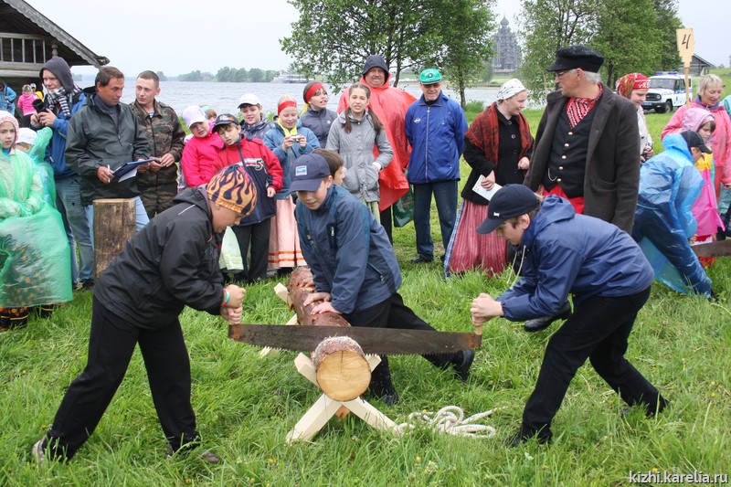 Первая остановка — у дома карельского крестьянина Яковлева — «Что нам стоит дом построить». Хозяин и хозяйка, представители ансамбля «Karjala», радушно встречали гостей с калитками, песнями и плясками. Тут же была организована плотницкая эстафета: ребята соревновались в скорости, ловкости, силе и мастерстве, перетаскивая и распиливая бревна, забивая гвозди. Победители получили лемеха и старые гвозди XIX века с Преображенской церкви: «Вот это подарок!» — восхищались ребята. «Потренируетесь — будете настоящими плотниками», — довольно улыбаясь, повторял начальник Плотницкого центра, Андрей Ковальчук. Детей с успешным прохождением эстафеты поздравила и министр культуры Республики Карелия, Елена Богданова: «Ребята, вы сегодня на славу потрудились, молодцы! Пусть в вашем доме половицы никогда не скрипят — это дело за мужчинами, а пол всегда будет чистым и улыбается — это дело рук женщин!»