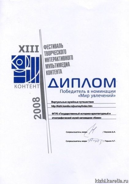 Музей-заповедник «Кижи» стал победителем в номинации «Мир увлечений» с интернет-проектом «Виртуальные музейные путешествия».