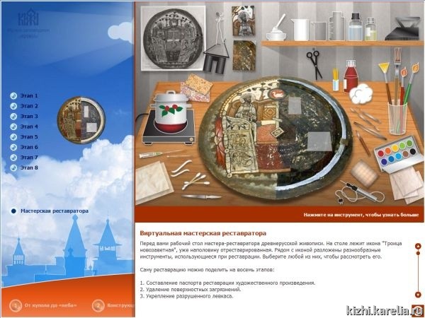 В конкурсный проект вошли разработанные в музее четыре виртуальных путешествия: «Путешествие по острову Кижи», «Виртуальное посещение дома карельского крестьянина», «Виртуальная экскурсия „Природа острова Кижи“, «Виртуальное путешествие „Небеса Заонежья“.
