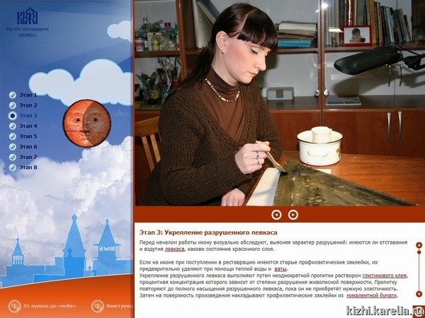 «Изюминкой» виртуального путешествия является «Виртуальная мастерская реставратора». На рабочем столе мастера находится икона и разложены инструменты, которые используются при реставрации древнерусской живописи. Детально показаны основные процессы реставрации и постепенное восстановление старинной иконы. В виртуальной мастерской находятся иконы «Троица новозаветная» («медальон») и «Евангелист Иоанн» («парус») — из часовни «Спас Нерукотворный» деревни Вигово.