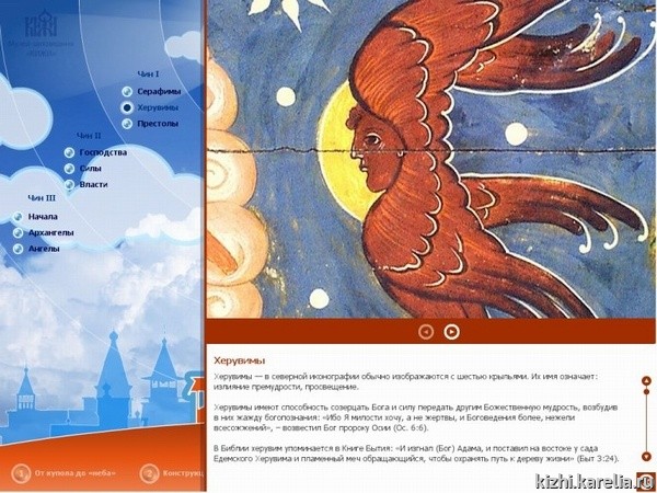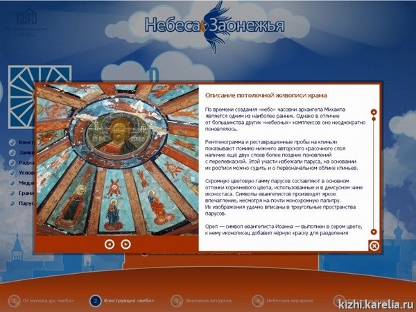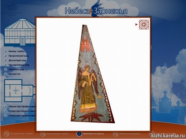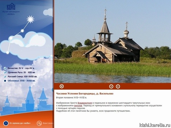 Это первое увлекательное виртуальное путешествие во времени и пространстве, которое можно осуществить сразу по нескольким памятникам деревянного зодчества Карелии. Во время этого путешествия можно увидеть собранные в виртуальном пространстве специально для этого проекта иконы «неба» из коллекции музея-заповедника «Кижи» и из кондопожской церкви, а также познакомиться с самими памятниками деревянного зодчества. В проекте представлено пять северных деревянных церквей и часовен: часовня Успения Богородицы из д. Васильево, часовня архангела Михаила из д. Леликозеро (они расположены на острове Кижи), церковь Николая Чудотворца из д Вёгорукса и церковь пророка Илии на Ильинском Погосте, оз. Водлозеро, чьи иконы находятся в собрании музея «Кижи», а также церковь Успения Богородицы из д. Кондопога.