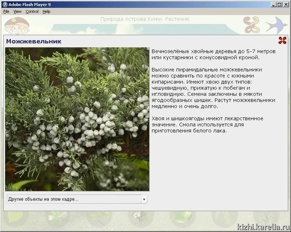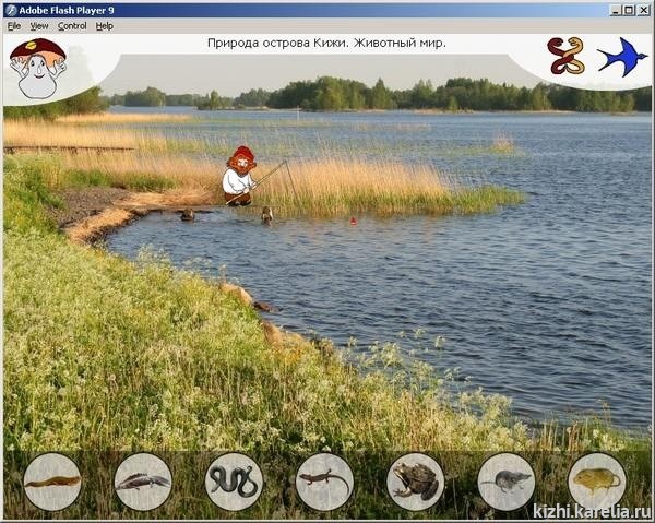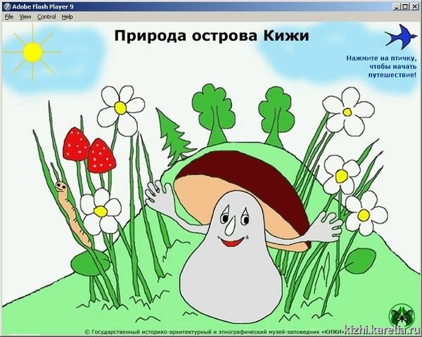 В виртуальной экскурсии по природе острова Кижи несколько разделов, где каждый сумеет найти для себя интересные моменты – «География», «Лента времени», «Геология», «Растения», «Животный мир», где подробно выделены птицы и животные-зимние гости острова и «Деятельность человека». Ведет гостей в таинственный мир островной природы гриб-экскурсовод Груня.