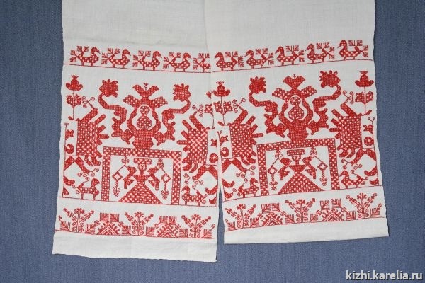 Изделия вепсских ткачих и вышивальщиц, наполненные древними символами, выглядят как загадочные картины. Вышивка - наиболее распространенный способ украшения текстильных изделий у вепсов. Вышивали вепсы бумажными и льняными нитями, в красно-белом, белом цветах, используя, двусторонний шов, строчку по сетке, крест, тамбур. Для вепсских вышивок характерны два типа орнаментов: изобразительные и геометрические. Полотенца обычно украшали стилизованными изображениями деревьев, животных, птиц.