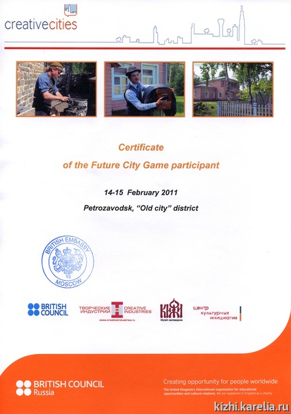 14 — 15 февраля в музее-заповеднике «Кижи» прошла игра-исследование «Город будущего». Игра проводилась Британским Советом в рамках лаборатории «Работа с сообществом и международные проекты» совместно с агентством «Творческие индустрии» (г. Москва), музеем-заповедником «Кижи» и Центром культурных инициатив Республики Карелия.