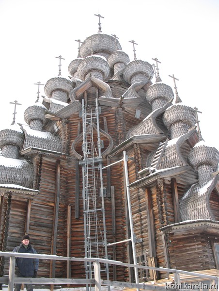 На сегодняшний день — главный вопрос — каким методом будут реставрироваться деструктивные бревна из нижнего пояса церкви. В производственном комплексе эксперты детально осмотрели собранный демонтированный пояс сруба. В процессе осмотра отбирались бревна по характерным типам и размерам деструктивных повреждений. Представители ИКОМОС консультировали специалистов музея «Кижи» по выбору методов реставрации бревен сруба.