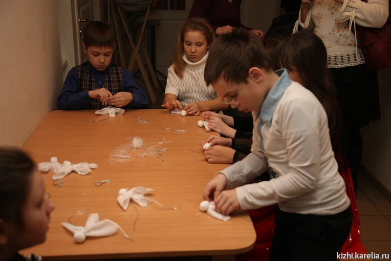 Посетители музея – и взрослые, и дети с удовольствием учились делать своими руками замечательный новогодний подарок – рождественского ангела. По традиции, светлую и радостную атмосферу Рождества создавало представление рождественского Вертепа. А в завершении программы гости принимали участие в весёлых народных играх и танцах, проводимых участниками фольклорно-этнографического театра музея «Кижи».