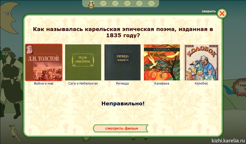 Раздел сайта музея-заповедника «Кижи» «Виртуальные путешествия» пополнился виртуальной игрой, созданной по мотивам фольклорной выставки «Два эпоса – две культуры». Выставка открылась в 2011 году в основной экспозиции музея на острове Кижи, в помещении усадьбы карельского крестьянина Яковлева и открыта в летнее время.