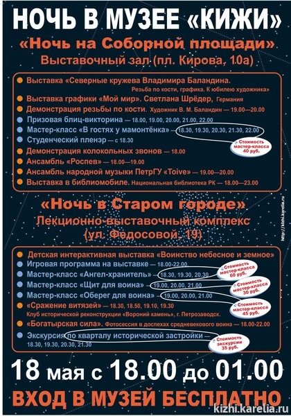 18 мая – особенный день для многих европейских и русских городов. Это единственное время в году, когда музеи Европы и России открыты для посещений в вечернее и ночное время. Цель Международной акции – привлечь в музеи новую аудиторию, показать возможности современных музеев. Акция, подготовленная музеем-заповедником «Кижи» в рамках Европейской ночи музеев, включает в себя две программы, рассчитанные для посетителей любого возраста – «Ночь в Старом городе» и «Ночь на Соборной площади».