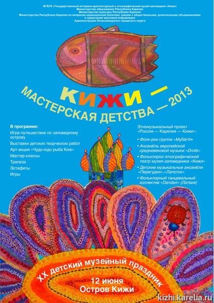 Детский музейный праздник «Кижи — мастерская детства» проводится с 1994 года ежегодно 12 июня на острове Кижи и стал заметным явлением в культурной жизни Карелии. Праздник направлен на деятельное участие детей в освоении историко-культурного и природного наследия Республики Карелия, на творческое развитие ребенка и семьи на основе этнокультурных традиций Русского Севера.