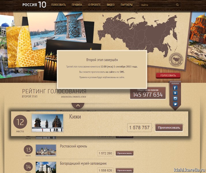 Сегодня в полдень завершился второй этап конкурса «Россия 10», на котором всенародным голосованием выбирают главные символы страны. На первом этапе конкурса за это звание боролись 800 достопримечательностей, во второй тур вышли 80 участников, в финале борьбу продолжат 30 исторических, культурных и природных памятников России. В том числе музей-заповедник «Кижи», который занял 12-ое место во втором туре с результатом 1 578 757 голосов.