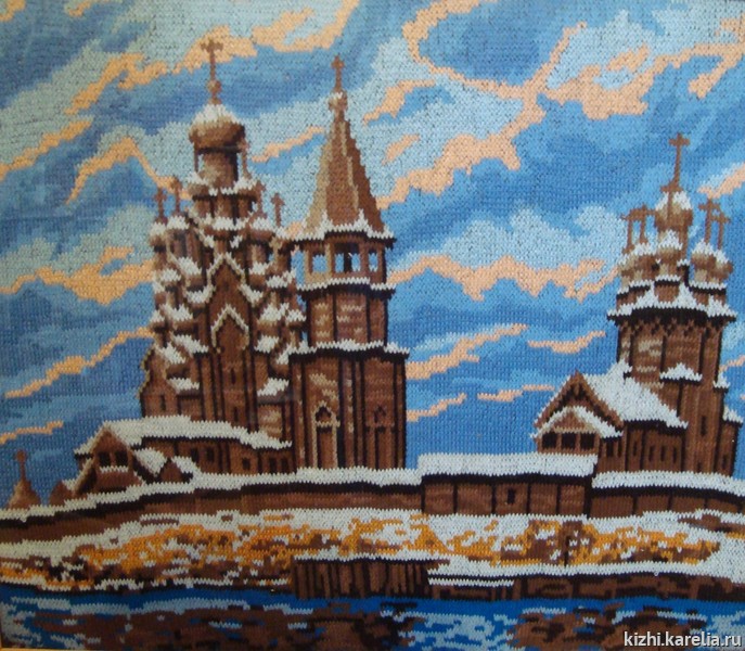 На выставке представлено 27 работ с видами церквей России, выполненных в технике «петля в петлю», которые мастерица вышила к 300-летию Преображенской церкви на острове Кижи.