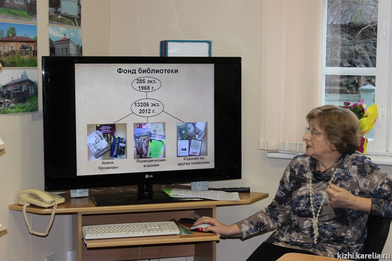 Ведущий библиотекарь А.И. Хикматова подробно рассказала об этапах 45-летнего пути: формировании библиотечного фонда, который за прошедшие годы вырос до 13 206 экземпляров, среди которых немало очень редких изданий конца XIX — начала XX веков; о людях, которые работали в разные годы в кижской библиотеке, которая в первые годы своего существования была передвижной: зимовала Петрозаводске, а на лето отправлялась на остров Кижи. Впоследствии фонд библиотеки разделился на городской и островной, но продолжая менять помещения. Кочевая жизнь островной библиотеки закончилась 15 лет назад — она обосновалась в доме Ананьевой в деревне Ямка, а городская библиотека, сменив несколько адресов, в 2006 году поселилась в отреставрированном музеем доме Лазарева в квартале исторической застройки Петрозаводска.