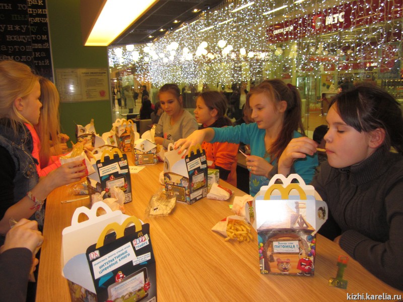 Очень выручили музей наши партнеры. Ресторан «Карельская горница» предоставил калитки для чаепития, и дети смогли попить чай после долгой дороги из Медвежьегорска. Кафе «Макдональдс» угостило ребят вкусным обедом «Happy meal». Внутри каждой коробки с обедом была маленькая игрушка, также в кафе ребятам подарили воздушные шары. Большинство детей никогда не обедали в «Макдональдсе», для них это стало приятным сюрпризом. Кинотеатр «Мираж синема» показал анимационный фильм «Холодное сердце», который не оставил равнодушными ни детей, ни взрослых. И, конечно же, многих, даже сопровождающих сотрудников детского дома, удивил торговый центр «Макси». Дети набегались по этажам, накатались на эскалаторах и лифтах!