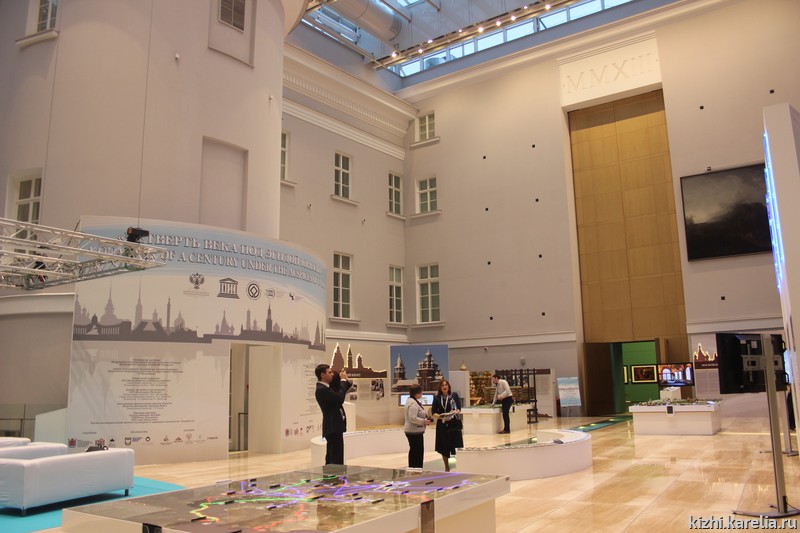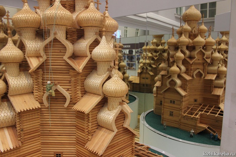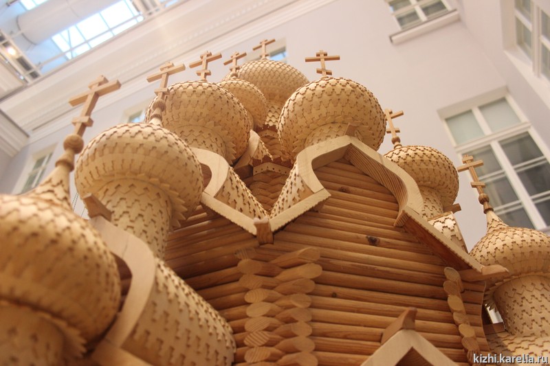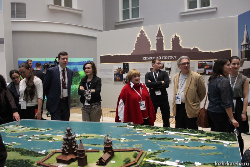 Часть выставки, посвященная Кижскому погосту, демонстрирует не только сам объект культурного наследия, но и территорию охранной зоны — той неповторимой историко-культурной и природной среды Заонежья, которая является неотъемлемой частью выдающейся универсальной ценности кижских памятников деревянного зодчества. Кроме того, здесь представлен макет системы уникальной системы лифтинга, которая была специально разработана для масштабной и сложной реставрации самого известного храма на острове Кижи — церкви Преображения Господня, а также макет самой церкви, выполненный мастерами Плотницкого центра музея «Кижи».