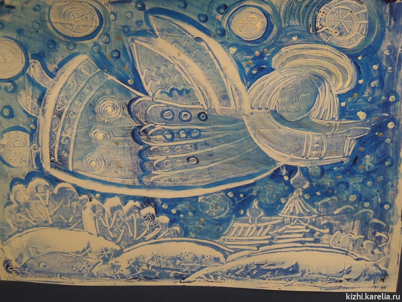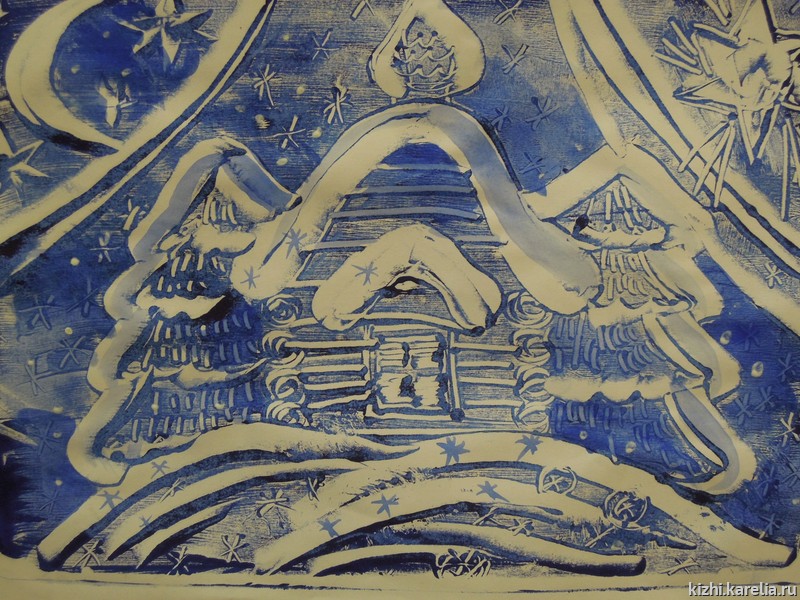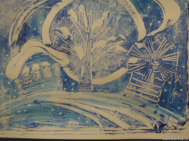 Автор программы выходного дня, руководитель студии «Кижская палитра» Светлана Петрякова познакомила участников программы с техникой диатипии, в которой им предстояло выполнить работу «Рождество в Кижах». Диатипия (от греч. dia — сквозь, через) является разновидностью монотипии, но имеет и существенные различия. Сначала на гладкую поверхность (дети использовали дощечки для лепки) специальным роликом наносится легкий слой синей краски, и по нему заостренной палочкой выполняется рисунок. Затем на дощечку накладывают лист белой бумаги, плотно его прижимают и получают замечательный оттиск рисунка в зеркальном отображении с интересной фактурой и цветовым фоном! Синяя окантовка-рамка придала работам законченный вид, а каждый ребенок унес с собой прекрасный рождественский подарок, выполненный своими руками!