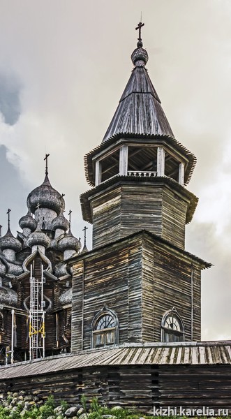 Первое упоминание об отдельно стоящей колокольне на Спасском Кижском погосте имеется в писцовой книге Петра Воейкова и Ивана Льговского 1616–1619 гг.: «А на погосте церковь Боголепного Спасова Преображения деревянной с папертьми, верх шатровый и Покрова Пресвятой Богородицы, теплой, то ж деревянной… а также колокола на колокольне». Кижская колокольня упоминается и в писцовой книге 1628–1631 гг.: «Да на колокольнице колокол весом тринадцать пудов» (208 кг).
