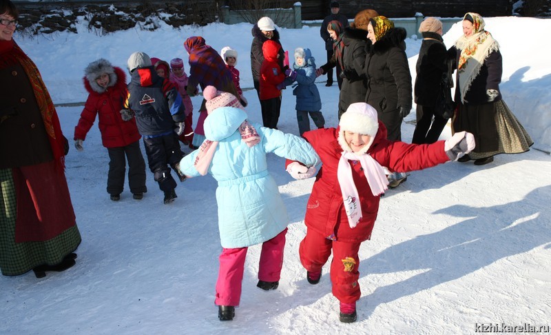 Знакомство с островом Кижи начнётся, конечно же, с экскурсии. Вы сможете познакомиться с культурой и историей русских Заонежья, увидеть шедевр деревянного зодчества — Кижский архитектурный ансамбль, и посетить деревню конца XIX — начала XX вв. После экскурсии вас ждет весёлая игровая программа: традиционные народные игры (игра с мячом, лапта) вместе с фольклорным коллективом музея-заповедника «Кижи», масленичные гадания. Катание с гор, на санях было одним из самых излюбленных и ярких забав в «Маслену неделю». Вы сможете оценить преимущества знаменитых «финских саней», ходить в снегоступах по снегу, носить воду с помощью коромысла, примете участие в обрядовых катаниях с гор на деревянных санках! Праздничное настроение поддержит бодрящий ароматный чай из самовара и блины с брусникой.