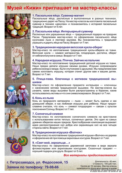 Мастера музея-заповедника «Кижи» готовы поделиться своим мастерством и научить всех желающих изготавливать традиционные русские, карельские и вепсские сувениры, куклы, обереги! Мастер-классы будут проходить в выставочном зале музея на ул. Федосовой, 19 для групп до 15 человек. Заявки принимаются по телефону 79-98-66.