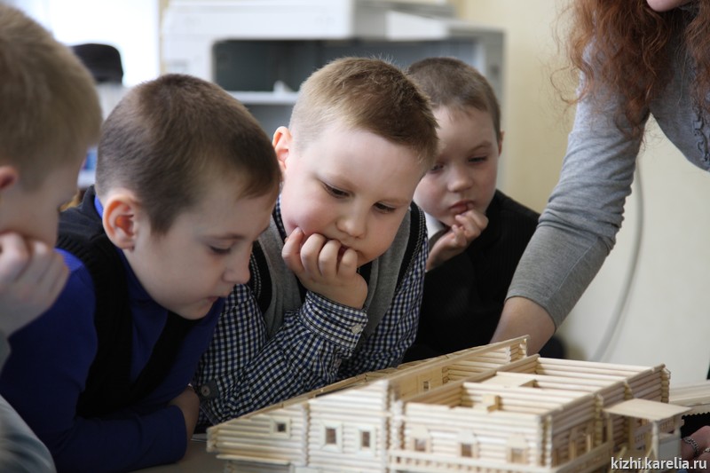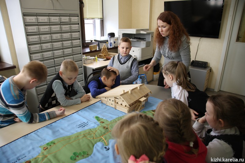 Кроме экскурсии-квеста, школьников в фондохранилище ждёт ещё интерактивное занятие, причём на выбор. Чалнинские первоклассники выбрали занятие «Маленький остров планеты Земля» — и в течение получаса они как будто побывали на острове Кижи: «побродили» по тактильной карте острова, познакомились с памятниками архитектуры, подержали в руках образцы дерева, из которого построена Преображенская церковь, лемех, которым украшены её главки, самостоятельно собрали модель амбара. Эти дети хотят теперь поехать на остров Кижи — увидеть памятники деревянного зодчества «вживую» и в полную величину!