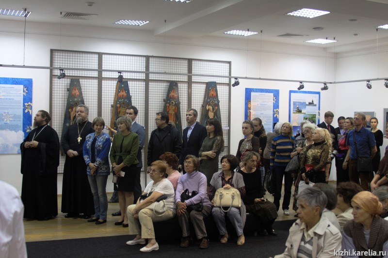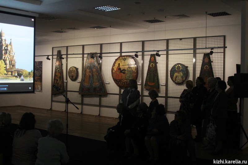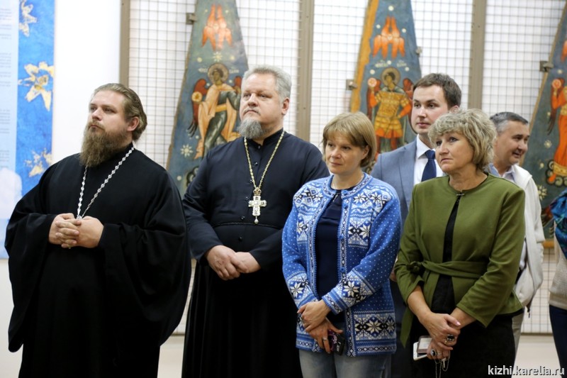 По завершению официальной части открытия ведущий научный сотрудник музея-заповедника «Кижи» Виола Анатольевна Гущина провела для всех желающих первую экскурсию по выставке. Идею выставки «Небеса» Заонежья» Виола Анатольевна видит в спасении человечества: «Все, что здесь изображено, направлено на то, чтобы человеку лучше было жить в этом мире».