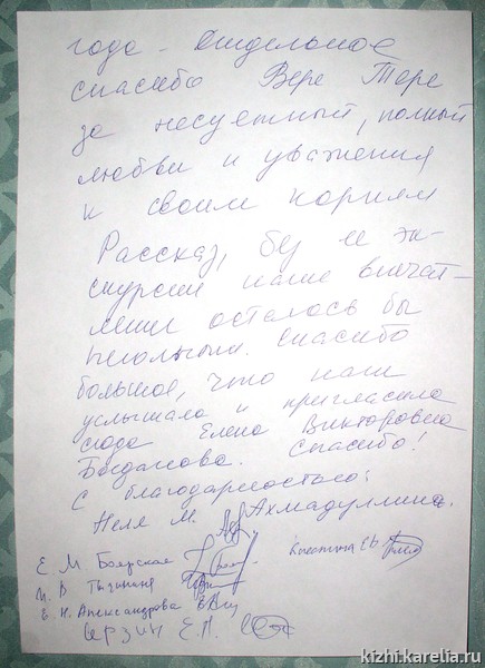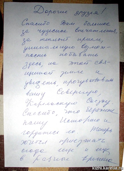 Спасибо вам большое за чудесные впечатления, за теплый прием, уникальную возможность побывать здесь, на этой священной земле и увидеть, почувствовать вашу Северную Карельскую Сказку. Спасибо, что бережете нашу историю и гордитесь ею. Теперь хочется приезжать сюда еще и еще в разные времена года. Отдельное спасибо Вере Тере за несуетный, полный любви и уважения к своим корням рассказ. Без ее экскурсии наше впечатление осталось бы неполным.