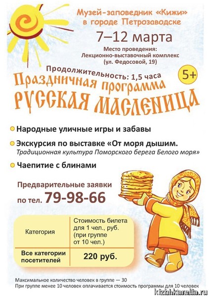 С 7 по 12 марта в квартале исторической застройки Петрозаводска пройдет праздничная программа «Русская Масленица». Музей-заповедник «Кижи» приглашает детей и взрослых встречать весну так, как делали наши предки: с играми, народными забавами, блинами и чаем из самовара! Масленичная программа музея «Кижи» пользуется большой популярностью среди жителей и гостей Петрозаводска. Среди постоянных участников этого яркого этнографического праздника — семьи, туристические группы, школьники, студенты и воспитанники детских садов.