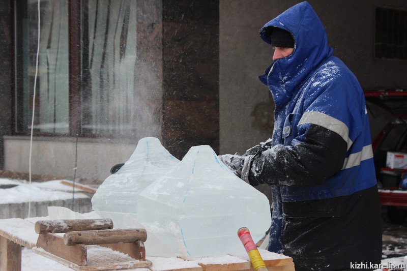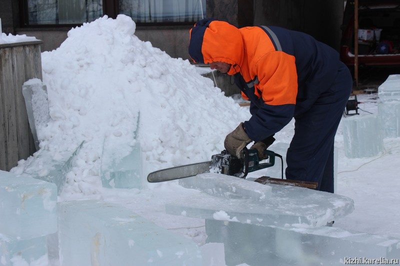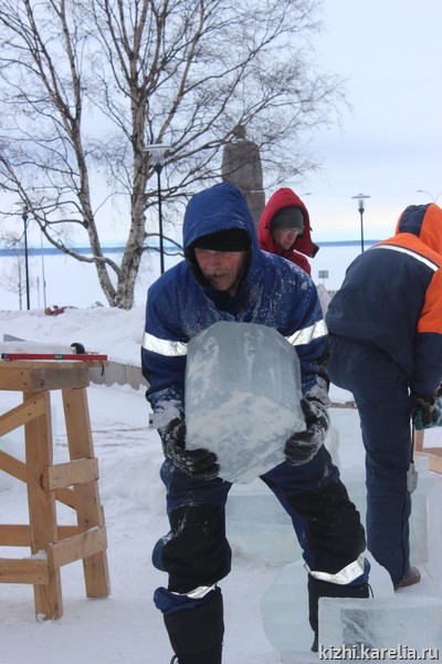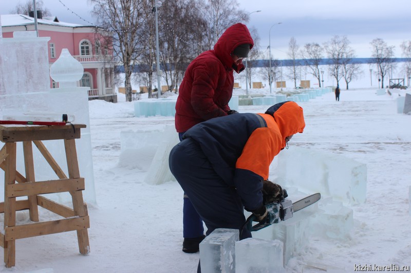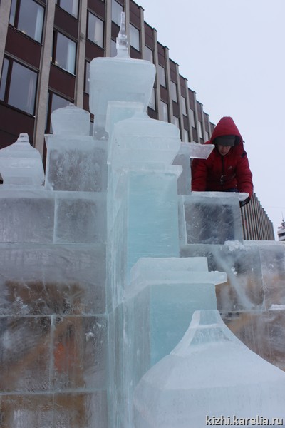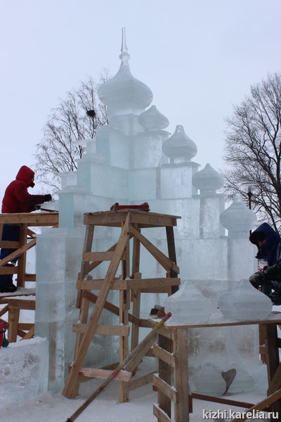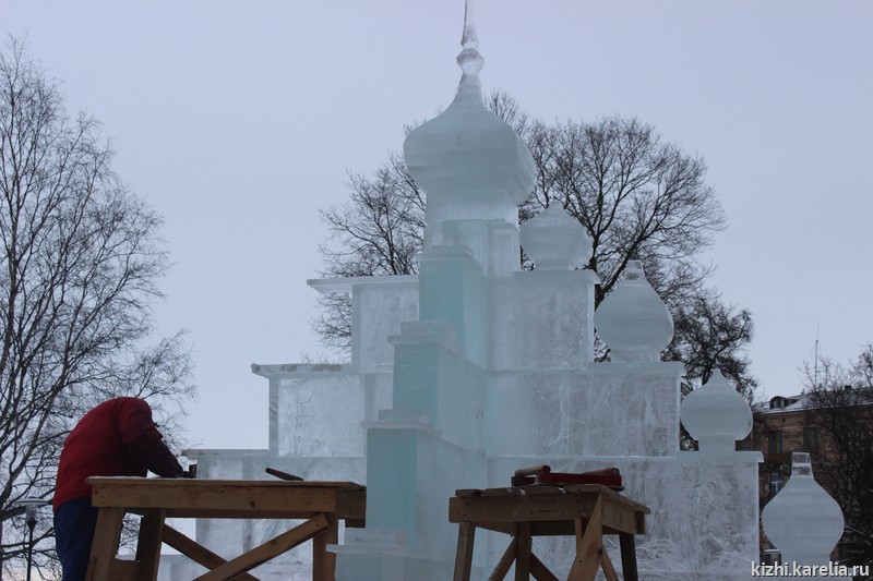 Завершаются работы по созданию ледовой скульптуры, символизирующей главный памятник острова Кижи — храм Преображения Господня. По заказу музея-заповедника «Кижи» стилизованную Преображенскую церковь создает команда скульпторов под руководством Александра Кима.