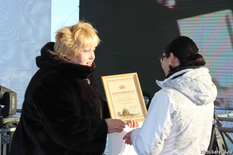 С приветствием к участникам и гостям фестиваля «Гиперборея» обратилась директор музея-заповедника «Кижи» Елена Богданова — поблагодарила за внимание к музею, поздравила с прекрасным завершением зимнего фестиваля «Гиперборея». Елена Викторовна вручила призы победителям викторины «Четверть века под эгидой ЮНЕСКО» — викторина проводилась среди посетителей одноимённой выставки. 3-е место в викторине заняла Дарья Карамзина, 2-е место досталось Дарье Кныш. А с 1-м местом, с победой в викторине, посвящённой 25-летию включения Кижского погоста в список Всемирного культурного и природного наследия ЮНЕСКО, мы поздравляем Ольгу Лазареву! В качестве приза Ольга получила сертификат на зимнюю поездку для двоих на остров Кижи для участия в праздничной программе «Масленица».