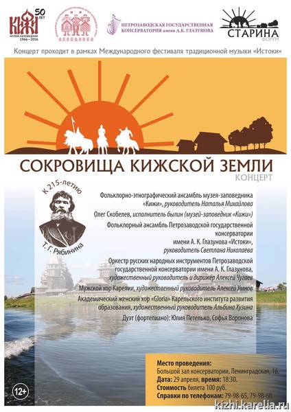 29 апреля в 18.30 приглашаем всех любителей старины и хорошей музыки в Большой зал Петрозаводской государственной консерватории (ул. Ленинградская, 16)! Концерт «Сокровища Кижской земли», который проводится в рамках Форума русской эпической культуры «Ста́рина», посвящен 215-летию заонежского сказителя Т. Г. Рябинина и 155-летию первого издания кижских былин.