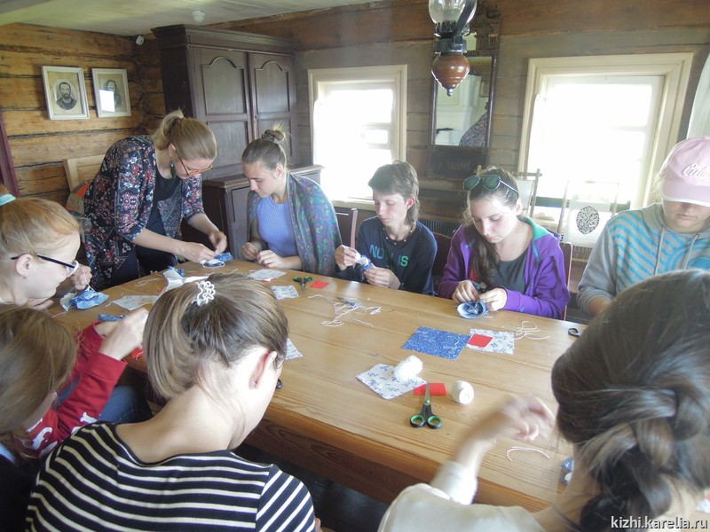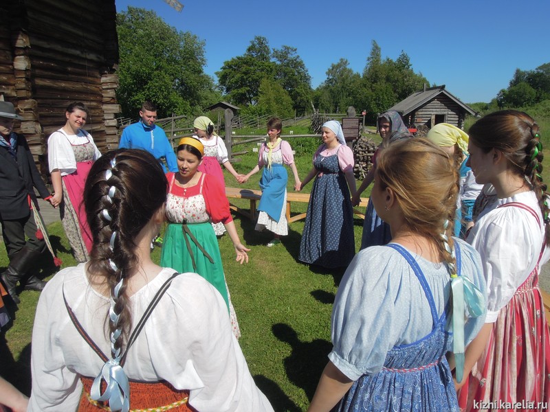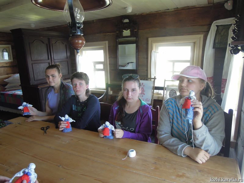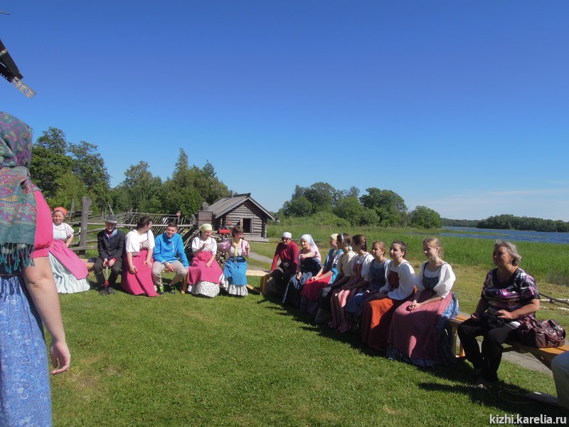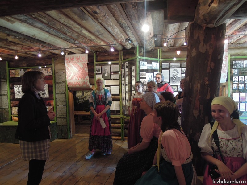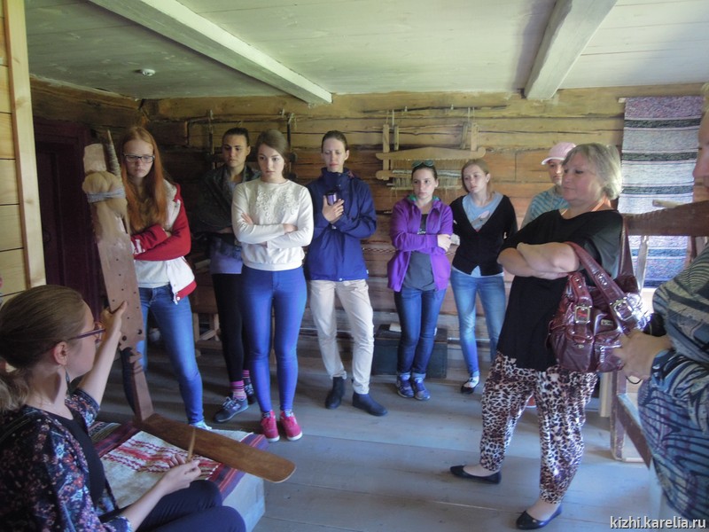 - «Нам, студентам РГПУ им. Герцена, посчастливилось проходить летнюю практику на острове Кижи, в одном из крупнейших музеев традиционной крестьянской культуры Карелии — в государственном музее-заповеднике „Кижи“. Мы приехали с проектом „Сказки маленьки, да удаленьки на онежской завалинке“. В Санкт-Петербурге наша группа изучала карельский фольклор, искала информацию в специальной литературе, потому что нас очень заинтересовала традиционная культура карелов, особенно их сказки и предания. Но, только побывав на острове Кижи, нам удалось максимально погрузиться в атмосферу деревенской жизни Заонежья. Благодаря фольклорному ансамблю мы познакомились с музыкальными инструментами, побывали на „молодёжных бесёдах“, поиграли в традиционные игры, и всё это — в народных костюмах! Это оставило массу положительных впечатлений!
