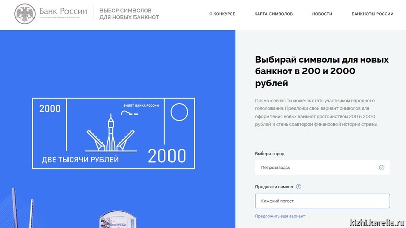 Банк России проводит конкурс, выбирая символы для новых банкнот достоинством 200 и 2000 рублей. Кижский погост может появиться на купюре номиналом 2000 рублей, для этого нужно проголосовать на сайте Банка России http://твоя-россия.рф