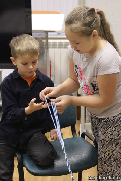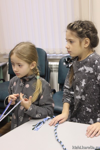 Плетение традиционного заонежского пояса не вызвало особых затруднений — дети прекрасно справились с заданием, каждый получил на память пояс-оберег. Старинное занятие, кроме своего практического назначения, ещё и очень полезно для малышей — развивает мелкую моторику.