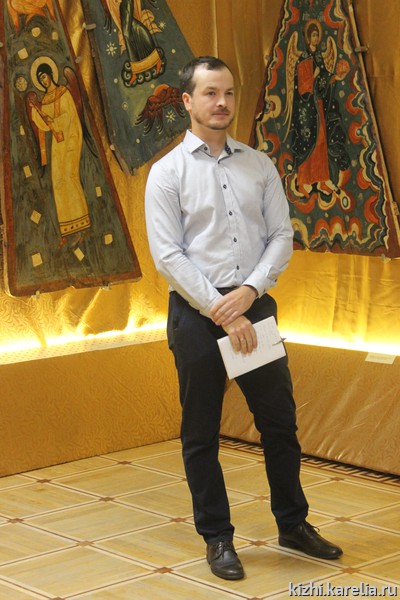У вас есть возможность ознакомиться с редкими памятниками древнерусской живописи, происходящими из Заонежья. Это, во-первых, образы XVIII века из иконостаса Преображенской церкви, которая сейчас закрыта на реставрацию. Во-вторых, это потолочные иконы «небес», имеющие необычную треугольную, трапециевидную или круглую форму. Ведь на «небесах» чаще всего изображались как раз силы небесные — ангелы. Дополняют основную экспозицию образы XVII и XIX веков, а также старинные книги и небольшие меднолитые иконы.