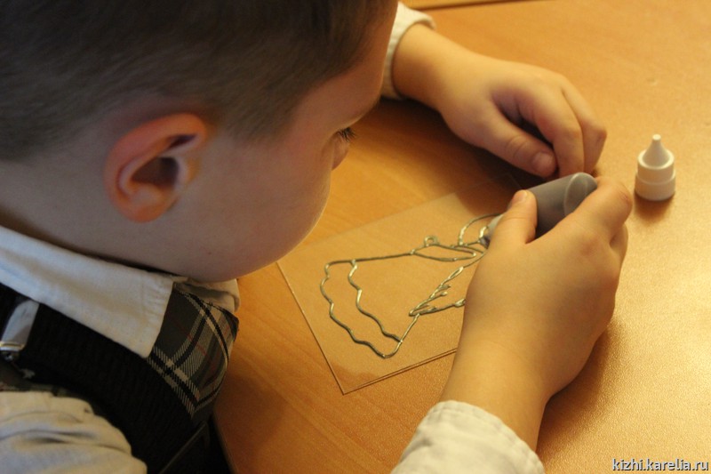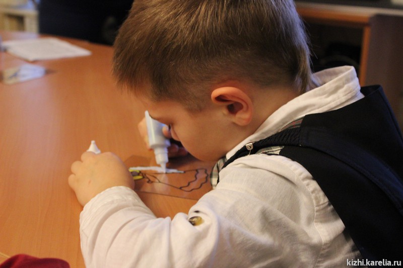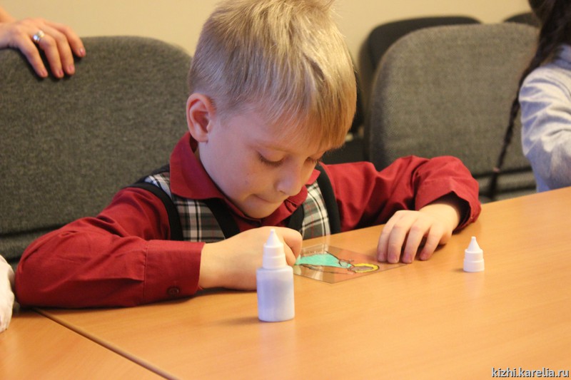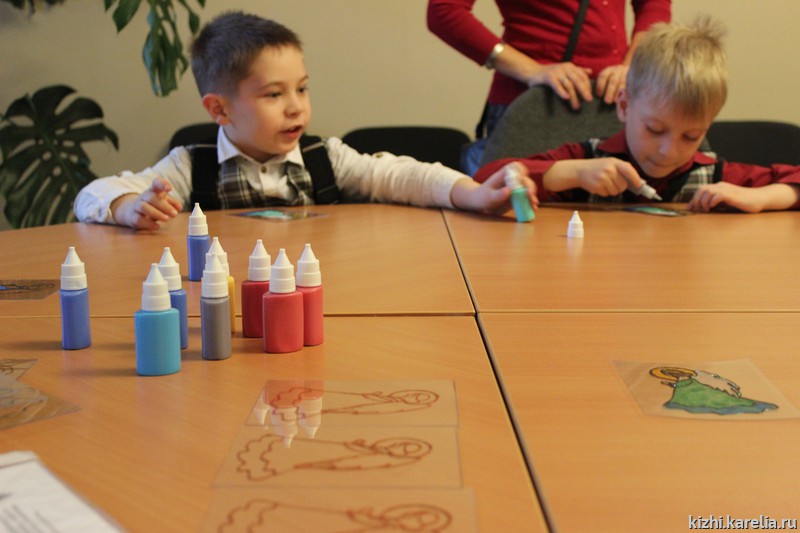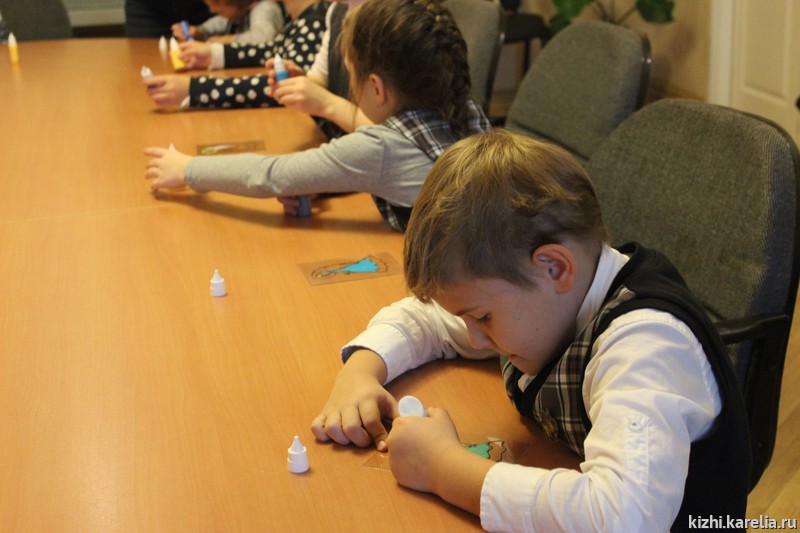 23 ноября участниками программы «Вестники добра» стали первоклассники: 1 «А» класс 5-ой петрозаводской школы в полном составе приехал в выставочный зал музея «Кижи» на пл. Кирова, 10 А. Класс большой, поэтому малышей сразу разделили на две группы — пока первая группа внимательно слушала рассказ экскурсовода, вторая осваивала технику «заливной витраж», затем они поменялись местами. Таким образом, в течение часа школьники не устали, занимались различными видами деятельности, получили много знаний, впечатлений, а также научились делать оригинальный сувенир.
