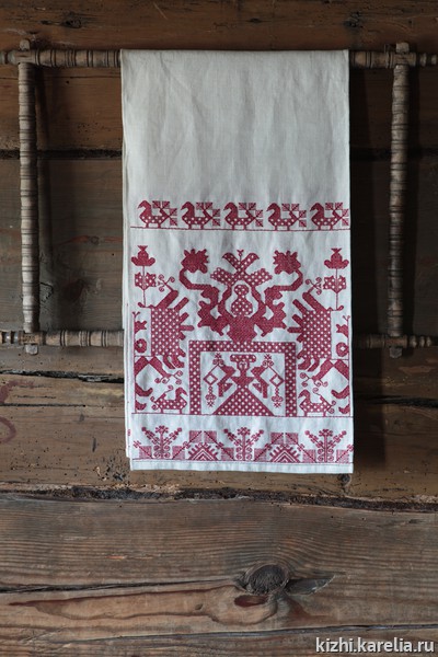 Вышивка была одним из самых любимых и распространенных женских ремесел в Олонецкой губернии. Для нее не требовались сложные приспособления, холст, нитки, иглы, пяла были в каждом крестьянском доме. Вышивали как правило льняными, а со второй половины ХIХ века бумажными нитками по белому льняному холсту или кумачу (красному ситцу). Расцветка северной вышивки строгая: белым по красному или красным по белому, что было характерно для всех регионов Карелии, кроме Пудожья и районов проживания северных карел, где встречалась многоцветная вышивка с использованием шелковых и гарусных (шерстяных) нитей. Символически красный свет связывался народным сознанием с образом солнца.