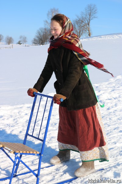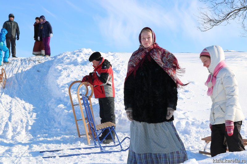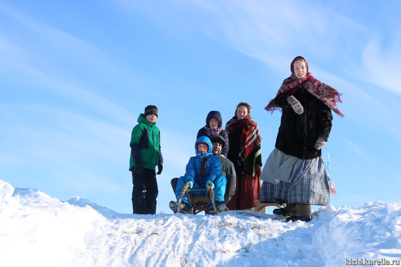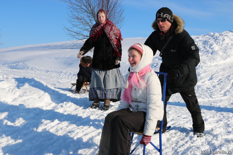 Ну и какая же зима без катания с горы? В Масленичную неделю катались и на русских санках, и на финских, дети и взрослые вдоволь навалялись в снегу, благо на острове Кижи он чистый-чистый, белоснежный.