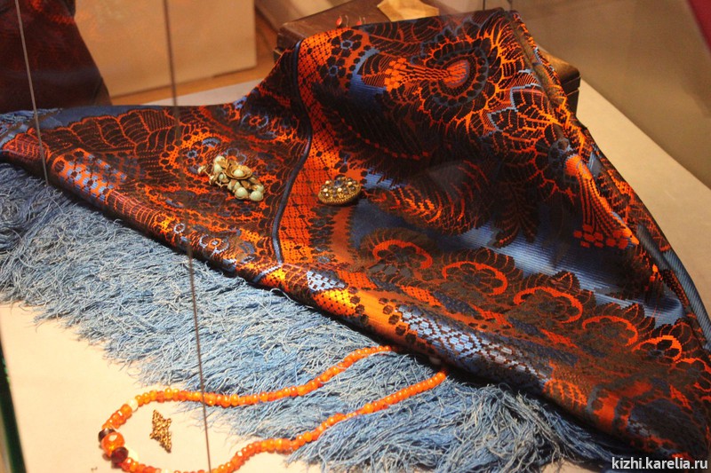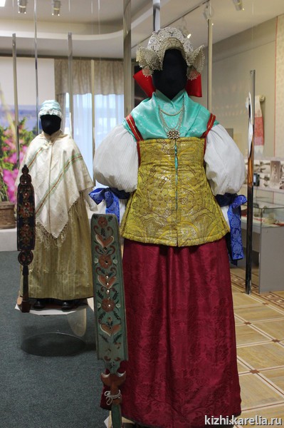 Костюмы прибалтийско-финских народов — карелов и вепсов — соседствуют на выставке с традиционной женской одеждой русских Пудожья и Заонежья. Рядом с праздничной парочкой вепсской женщины расположен будничный костюм сегозерской карелки, жатвенный наряд пудожанки соседствует с парадным костюмом состоятельной каргополки. Среди редких памятников, представленных на выставке,— уникальный заонежский свадебный комплекс конца XIX — начала ХХ века, сохранивший черты русской одежды XVIII столетия.