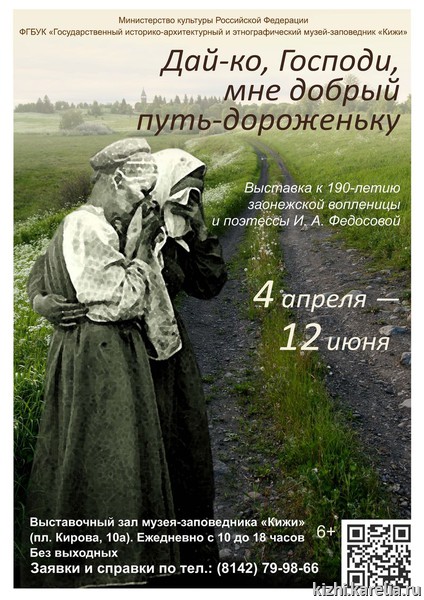 4 апреля в 16:00 в Презентационно-выставочном центре музея «Кижи» в Петрозаводске (пл. Кирова, 10 А) откроется выставка «Дай-ко, Господи, мне добрый путь-дороженьку». Выставка посвящена 190-летию со дня рождения Ирины Федосовой, заонежской крестьянки, прославившей свою родину на весь мир. Ирина Андреевна была удивительно талантливой исполнительницей причитаний — народных песен-плачей. От неё записано свыше 30 000 стихов. Издание этих текстов признано выдающимся событием в фольклористике и этнографии конца XIX века.