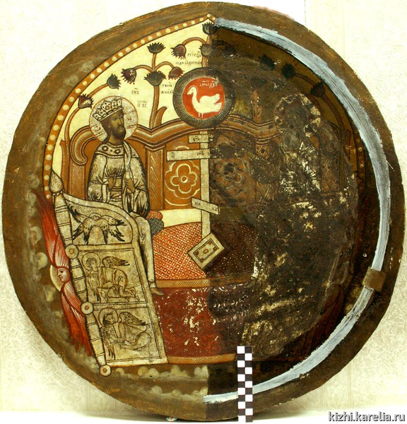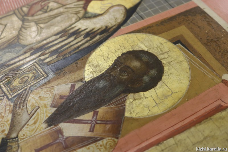 На столах в мастерской Надежды две иконы: «Успение Богоматери» и «Архангел Михаил», обе из Преображенской церкви Кижского погоста. «Успение» находится в «палате выздоравливающих». Можно было бы сказать, что она «заметно посвежела», но это будет неправда — глазу непрофессионала эти мельчайшие изменения увидеть не дано. А между тем, после того, как икона вернулась с выставки, её немедленно отправили к реставратору — на «оздоровительные процедуры». К сожалению, даже в таком крупном федеральном музее, как «Кижи», выставочные залы не оснащены необходимым оборудованием, способным поддерживать постоянный круглосуточный температурно-влажностный режим. А это главное условие для долгой жизни икон, да и большей части всех музейных предметов.