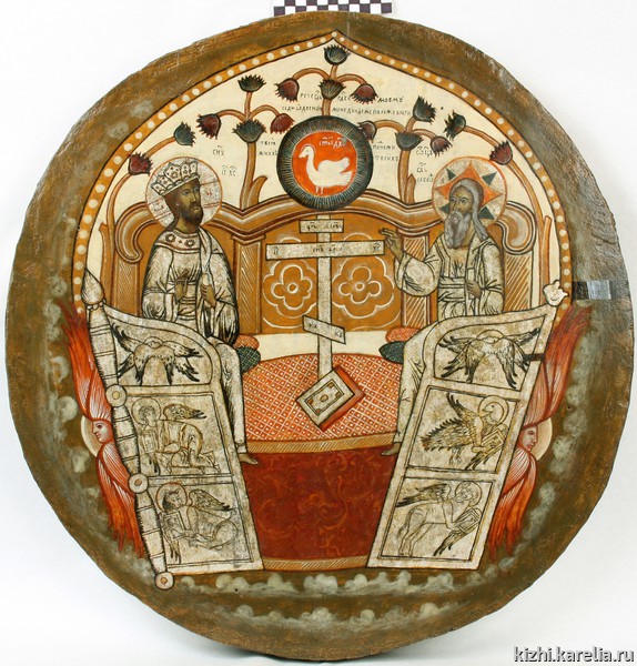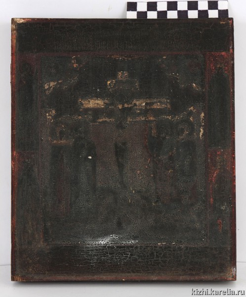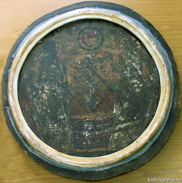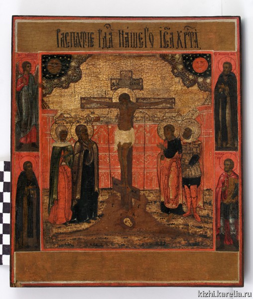 Надежда показывает некоторые «истории» и у неё загораются глаза. Так называемое «раскрытие икон» — действительно увлекательный и часто непредсказуемый процесс. Вот икона второй половины XIX века «Распятие с Предстоящими» из деревни Панозеро Кемского района Карелии. В руки Надежды Куусела она попала в виде почти абсолютно чёрного, закопчённого прямоугольника. Где-то там посередине угадывался крест, и только. В результате «раскрытия» обнаружилось яркое и наполненное деталями изображение.