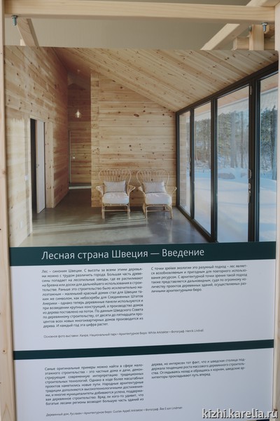 Фотографии, представленные на выставке, демонстрируют лучшие образцы шведской архитектуры последних лет — жилые здания, школы, детские сады и другие объекты. И всё это, конечно, из дерева. Самый экологичный, самый красивый и, как показывает опыт специалистов музея «Кижи», один из самых долговечных материалов.