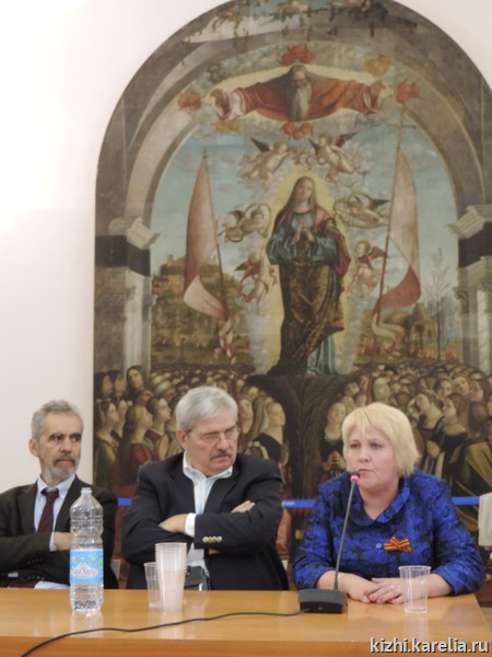 Со стороны музея выступили руководитель службы по учету и хранению недвижимых памятников Александр Любимцев, руководитель службы по обеспечению сохранности и целостности историко-архитектурного комплекса Татьяна Незвицкая, руководитель службы по управлению и развитию объекта Всемирного наследия Ольга Титова, начальник отдела реставрации Андрей Ковальчук, а также руководители представители подрядных организаций, ведущих реставрацию церкви Преображения Господня на о. Кижи: Александр Савельев, Виталий Скопин, Алексей Чусов. При этом А. Ковальчук, В. Скопин и А. Чусов — реставраторы высшей категории; в России таких специалистов всего шесть, и трое из них работают над реставрацией Преображенской церкви. Итальянские специалисты — Д. Кавеццали, Д. Тампоне, К. Модена, Ф. Лизерре и Д. Галотта — также рассказали о своих реставрационных проектах. Некоторые из выступавших бывали на острове Кижи в составе миссий ЮНЕСКО и дали высокую оценку труду своих российских коллег.